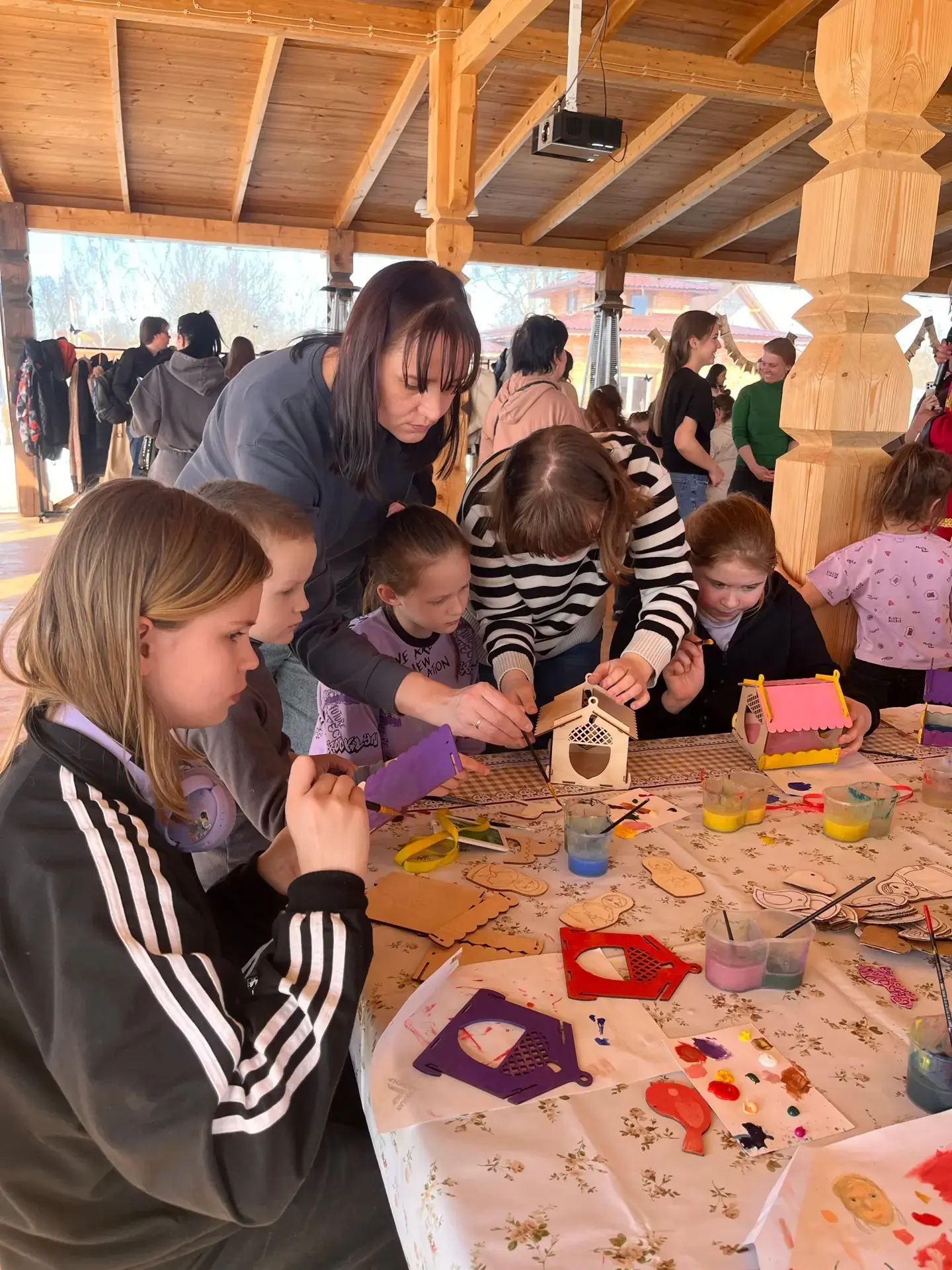 Елена Александровна Векшина — художник декоративно-прикладного искусства — вместе с тремя волонтёрами-девятиклассницами увлекла гостей росписью матрёшек, птичек и сборных кормушек. Татьяна Александровна Ушанова лепила с ребятишками фигурки из воздушного пластилина и мастерила брелки из макраме. Каждый уходил с поделкой, сделанной своими руками.