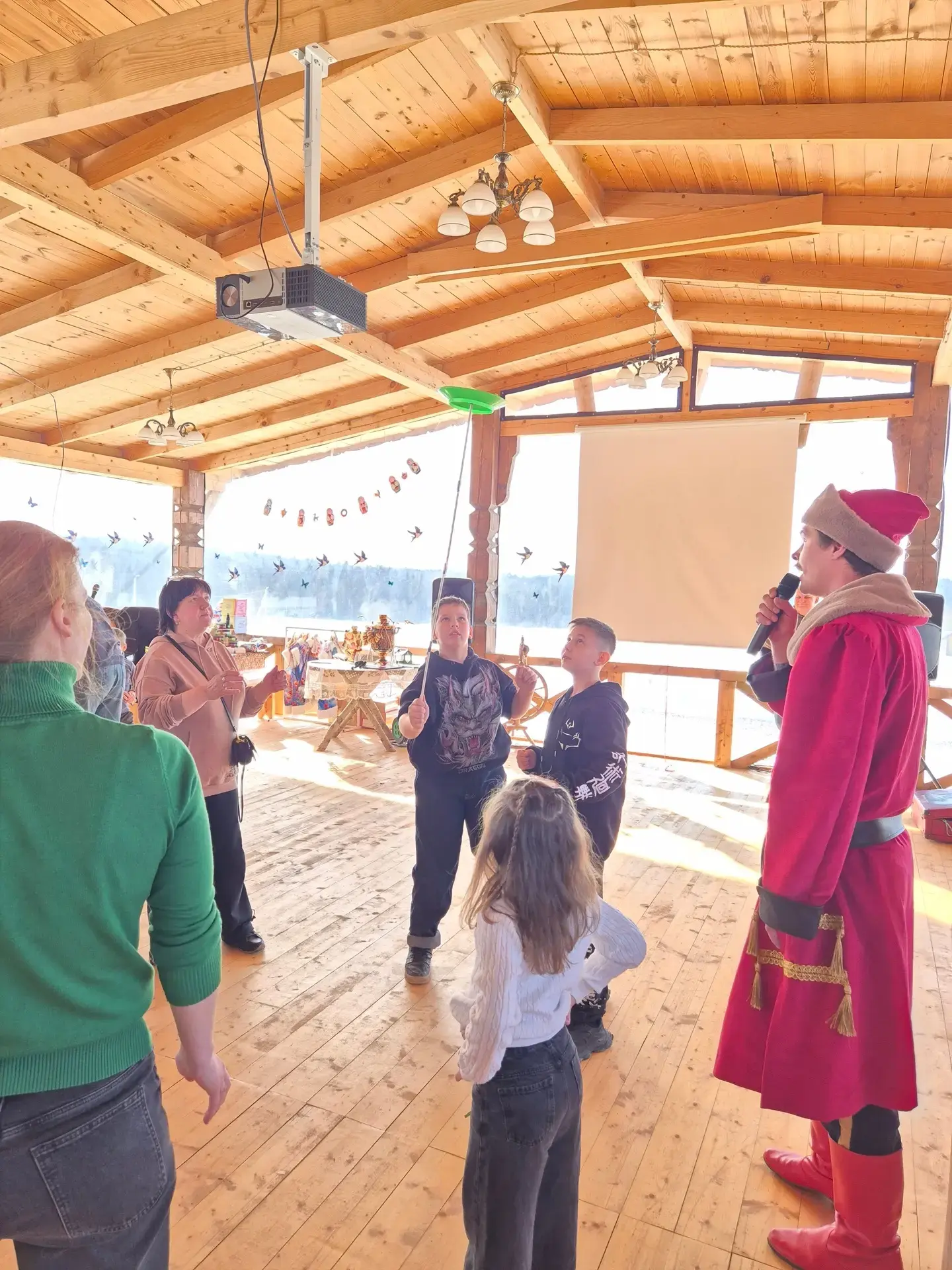 Программа началась не с традиционной интерактивной экскурсии, а с шапочного боя, танцев с пандой и викторин. Потому что по счастливой случайности автобус домчал всех гостей из Догопрудого на час раньше запланированного начала. И уже после развлечений все последовали в избушку и отведали картошку из чугунка, покормили животных и собрали у кур цветные яйца. А дальше - угощение, творчество и общение!